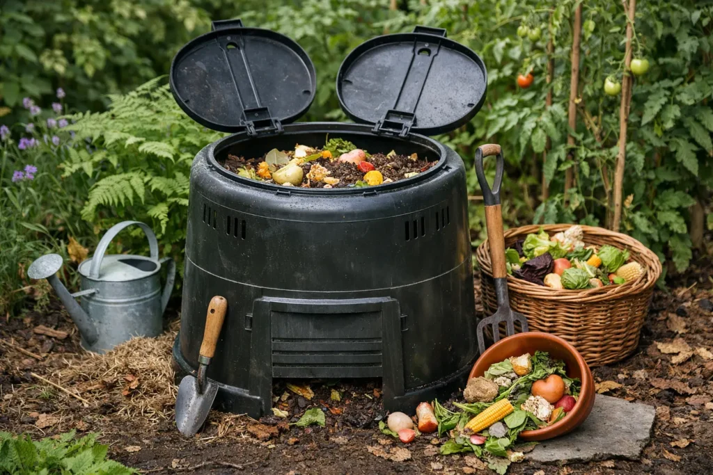A home compost bin turns kitchen scraps and yard waste into nutrient-rich soil. It reduces household waste and improves garden soil structure without chemical fertilizers.